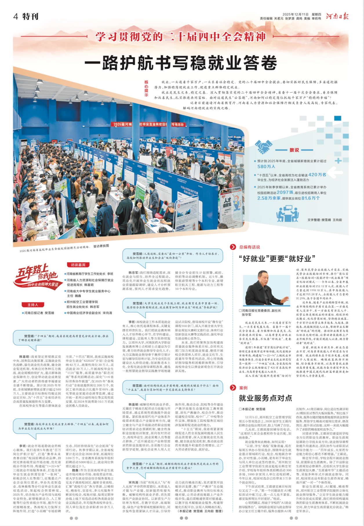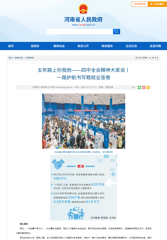 12月11日,河南省人民政府网站及新媒体,《河南日报》版面、客户端及视频号推出专题报道《一路护航书写稳就业答卷(五年路上你我他——四中全会精神大家谈)》,对我校立体化全过程就业举措进行采访报道。