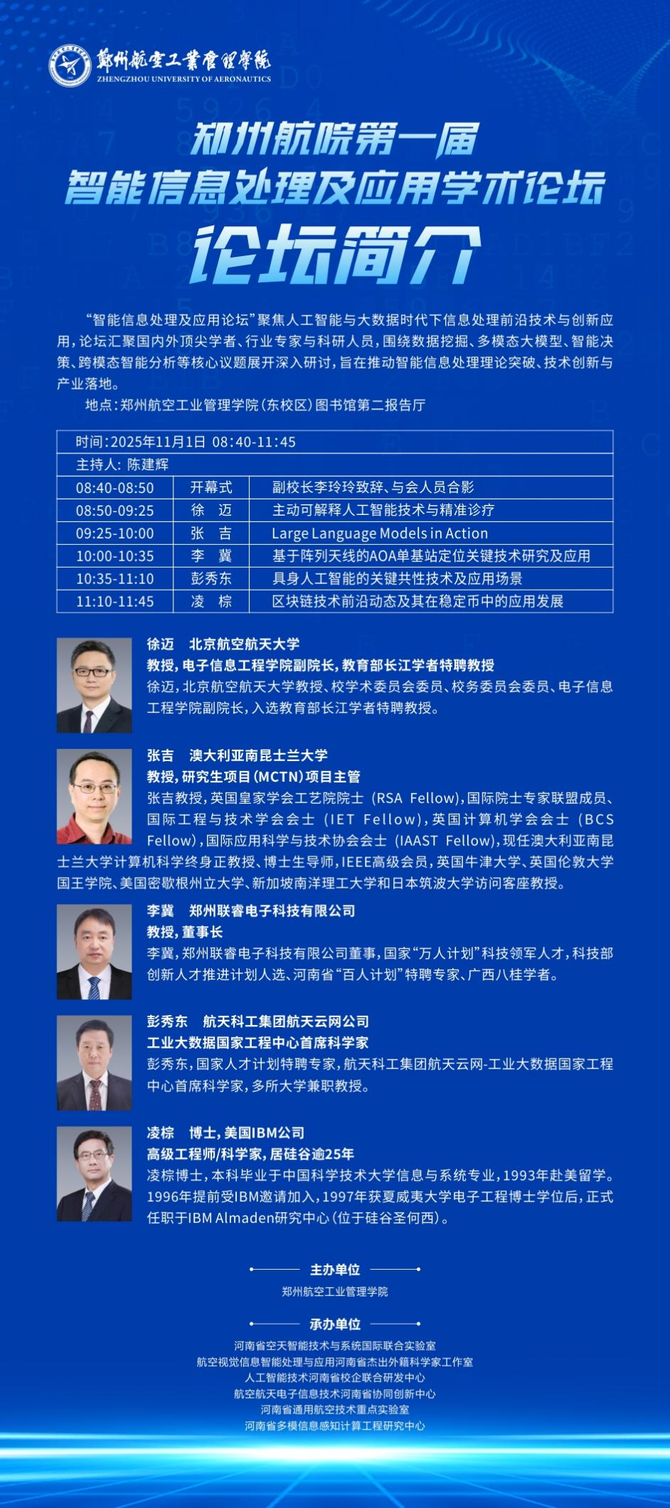 紧跟人工智能时代发展浪潮,推动智能信息处理领域的理论突破、技术创新与产业落地,搭建国内外学术交流与成果转化的优质平台,我校特主办“郑州航院第一届智能信息处理及应用学术论坛”,论坛拟于2025年11月1日(星期六)上午举办。