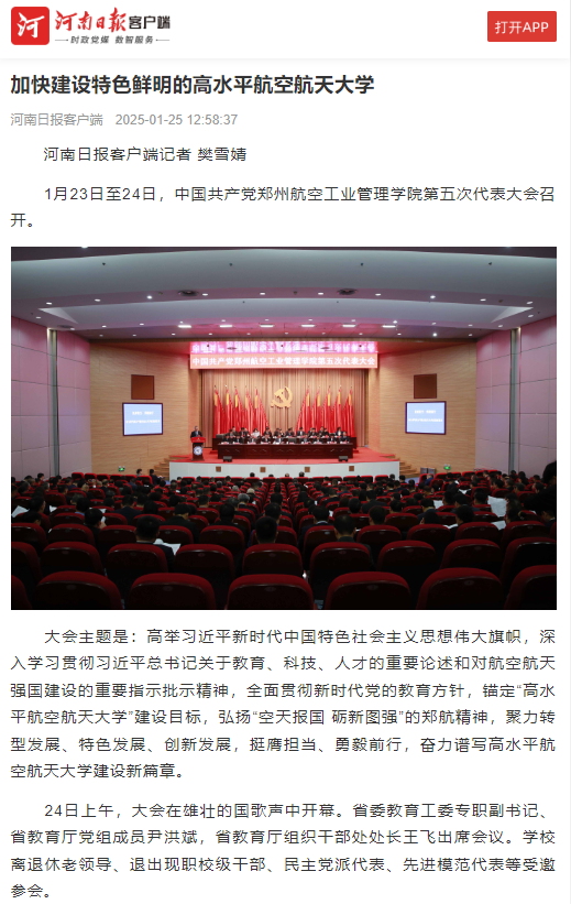 1月23日至24日,中国共产党郑州航空工业管理学院第五次代表大会召开。河南日报客户端、大象新闻、大河网、正观新闻、映象网、顶端新闻、河南教育宣传网、河南高教微信公众平台、搜狐新闻、网易新闻、今日头条等进行了报道。