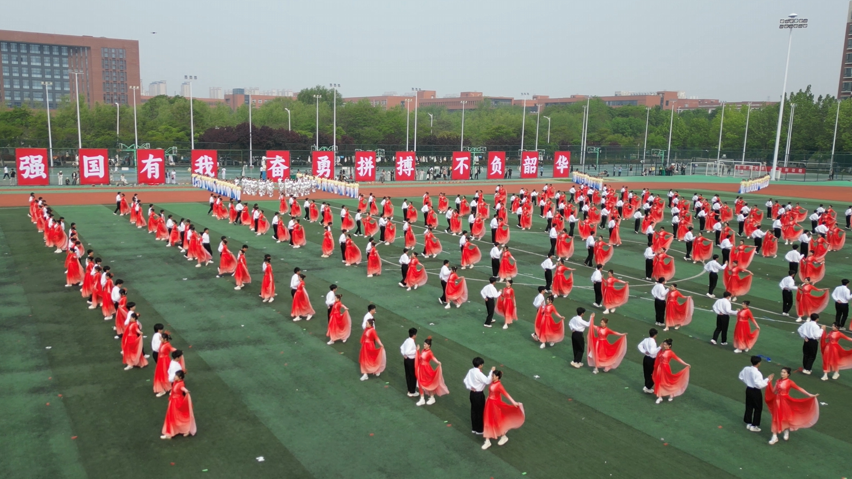 节目展示环节,航模表演率先登场,河南省重竞技航空运动中心航空模型项目团队先后带来线操纵特技飞行、固定翼四机空战、手操遥控滑翔机飞行、直升机遥控花式特技飞行等表演,航模腾空而起,在体育场上空盘旋、俯冲、翻转、追逐,一组组高难度操作干净利落,惊艳全场。多旋翼无人机将“运动激扬青春,奋斗成就梦想”的条幅高高悬起,随风展开,在蓝天映衬下格外醒目。千余名手持彩旗的同学随即奔向操场中央,彩旗翻飞,队列变化,定格为“空天ZUA”字样与一架蓄势起飞的飞机造型。随着场上曲风转换,华尔兹集体舞蹈登场,红裙飞扬,舞步轻盈,为赛场添了几分柔美。压轴的是舞扇团体表演,300名学生挥动蓝色舞扇,扇面开合,层层铺展,如云海翻涌,喝彩声与鼓点声交织,看台上掌声与呐喊声久久不息。