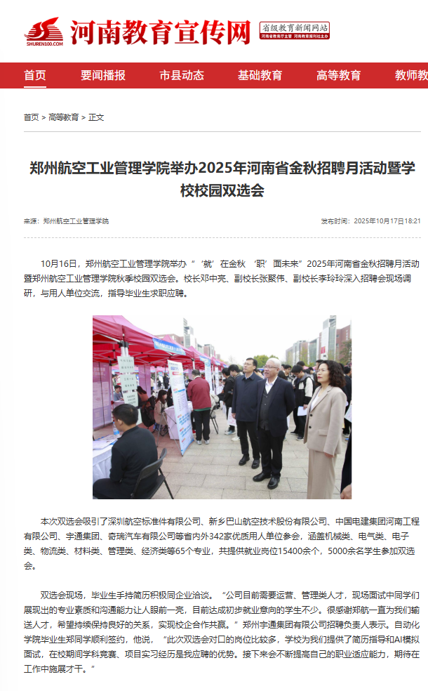 10月16日,我校举办“‘就’在金秋 ‘职’面未来”2025年河南省金秋招聘月活动暨秋季校园双选会。校长邓中亮、副校长张聚伟、副校长李玲玲深入招聘会现场调研指导。河南教育宣传网、大象新闻、顶端新闻进行了报道。