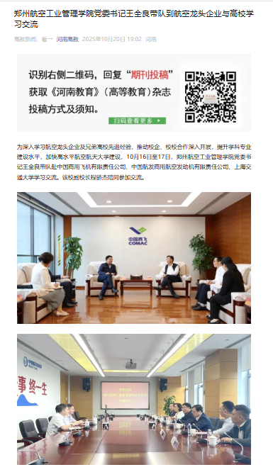 10月16日至17日,校党委书记王全良带队赴中国商用飞机有限责任公司、中国航发商用航空发动机有限责任公司、上海交通大学学习交流。副校长程骄杰陪同参加交流。河南高教微信公众号、河南教育宣传网进行报道。