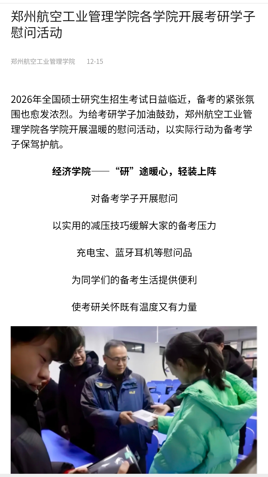2026年全国硕士研究生招生考试日益临近,近日各学院开展了形式多样的考研慰问活动,为学子加油鼓劲、传递温暖。河南手机报进行了报道。