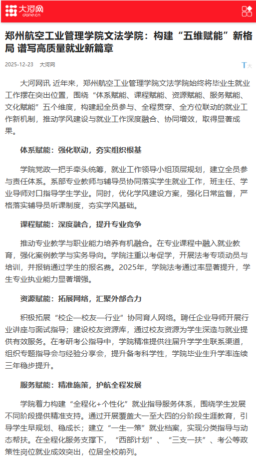 近日,大河网连续推出系列报道《郑州航空工业管理学院文法学院:构建“五维赋能”新格局 谱写高质量就业新篇章》《从校园到边疆:郑航文法学院精准引导,助力学子书写西部法治青春》《从书香校园到沃野乡村:郑航文法学院2025届毕业生马玉条的西部计划“扎根”记》,多角度报道了我校文法学院在就业育人、就业引导与服务等方面的创新思路和实践成果。