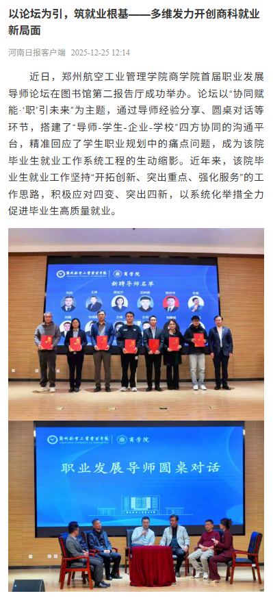 近日,我校商学院首届职业发展导师论坛圆满落幕,论坛以“协同赋能·‘职’引未来”为主题,通过导师经验分享、圆桌对话等环节,搭建了“导师-学生-企业-学校”四方协同的沟通平台。顶端新闻对该活动及学院促就业举措进行报道。