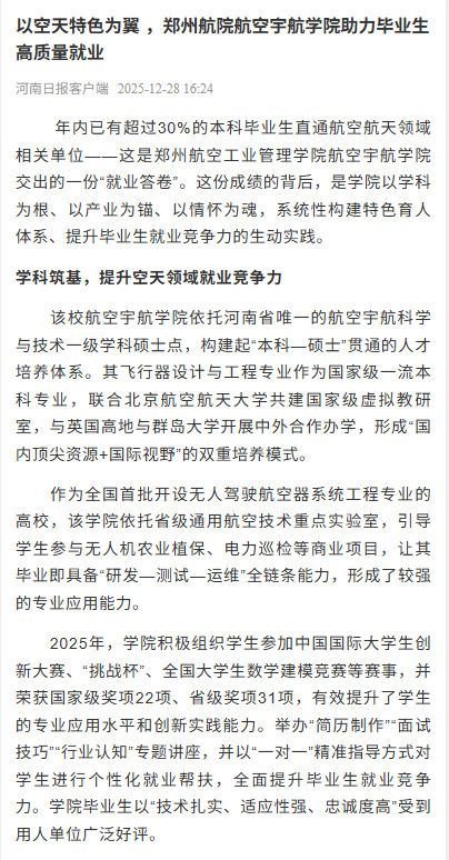 近日,河南日报客户端对我校航空宇航学院毕业生就业工作进行全面报道。报道从学科筑基、校企协同、文化育人等方面展示了学院特色育人体系及就业成果。