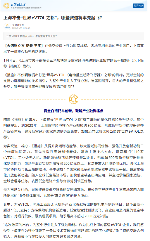 1月6日,大河财立方推出深度报道《上海冲击“世界eVTOL之都”,哪些赛道将率先起飞?》,报道聚焦《上海市关于链接长三角加快建设低空经济先进制造业集群的若干措施》的发布,解读上海建设“世界eVTOL之都”的政策动向、发展路径及市场机遇。我校航空经济发展河南省协同创新中心主任常广庶在接受采访时分析道,从短期来看,大部分企业在飞控系统、主控芯片等核心零部件领域自主攻关能力仍然较弱,研发投入普遍不足,产品结构相对单一,同质化竞争现象比较突出,因此当前关键核心系统和技术具有较高的投资价值。“上海的低空经济发展也面临普遍性挑战,其中最大的挑战在于空域管理与审批机制不够完善...跨省市的政策与机制的协同,以及基础设施网络的支撑将成为破解空域瓶颈、释放规模化效益的关键创新。”