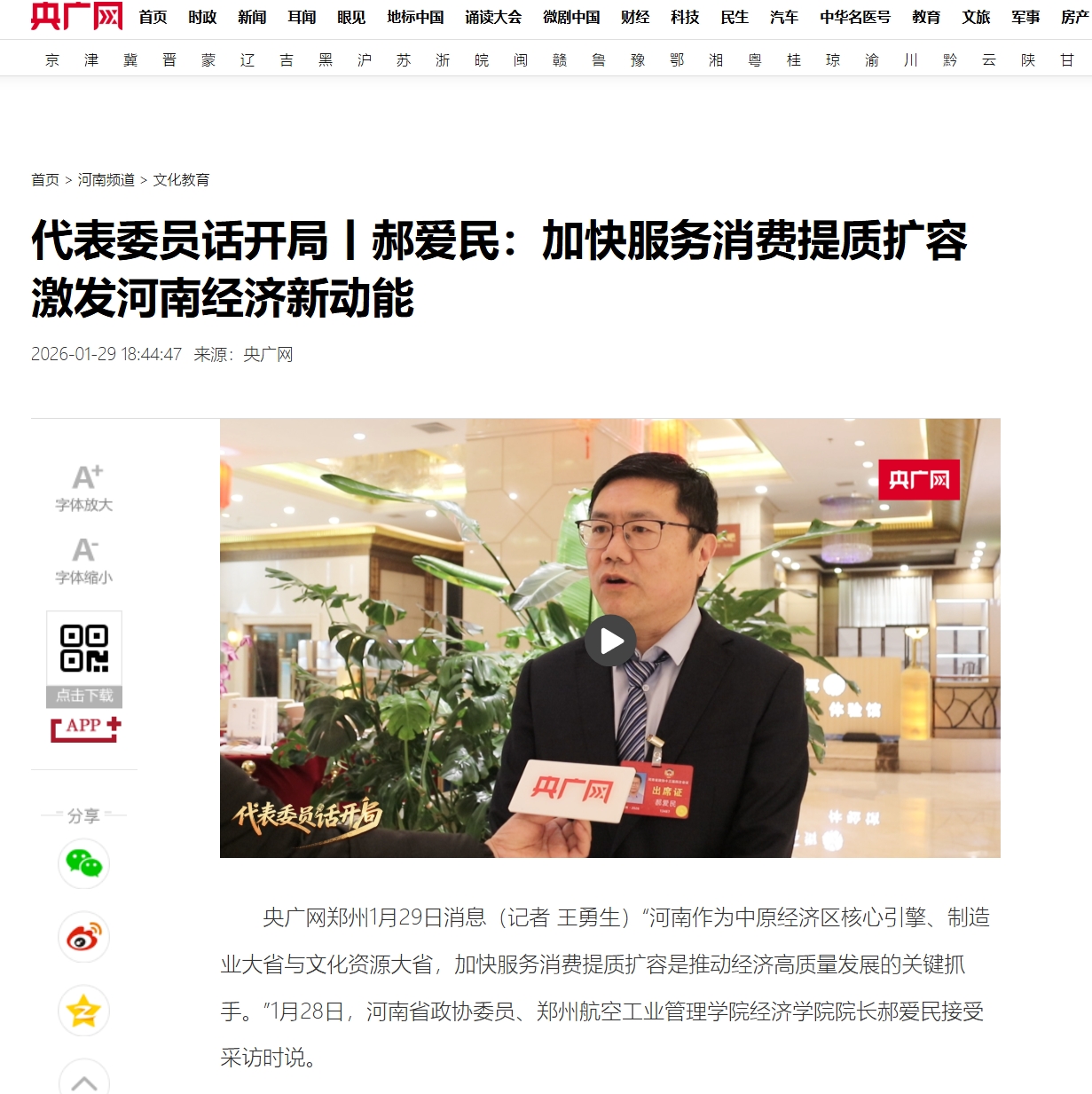 近日,河南省政协委员、我校经济学院院长郝爱民接受央广网、河南日报、顶端新闻记者关于河南省两会的专题采访,对河南现代化产业体系搭建、服务消费市场拓展以及跨境电商发展等方面作出解读,提出观点与建议。