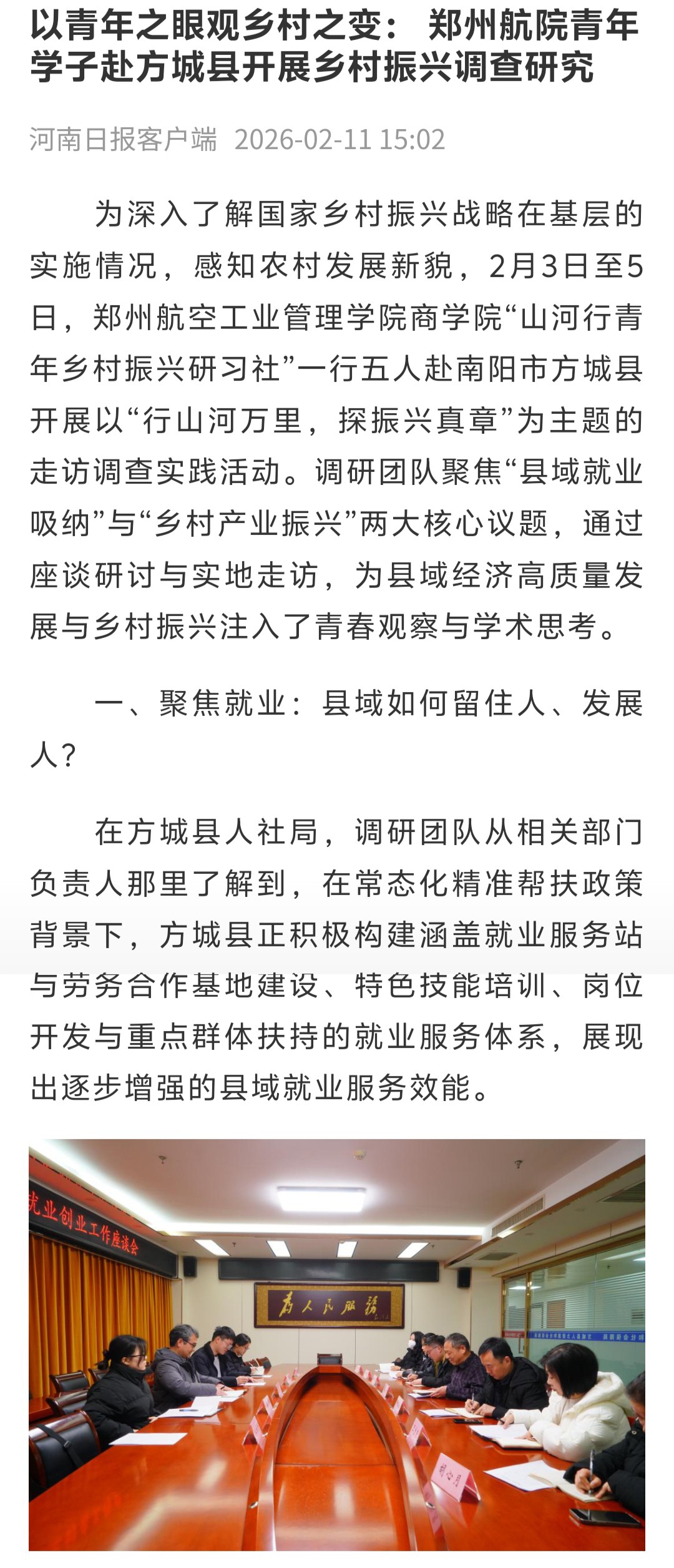 近日,河南日报客户端对我校商学院“山河行青年乡村振兴研习社”及“古村焕活实践团”的乡村振兴调研实践活动进行系列报道。实践团队分别围绕县域经济高质量发展、乡村产业资源开发等方向深入一线实地调研,以青春视角观察基层实践,用专业知识赋能乡村发展,为全面推进乡村振兴注入鲜活的学术思考与青年力量。