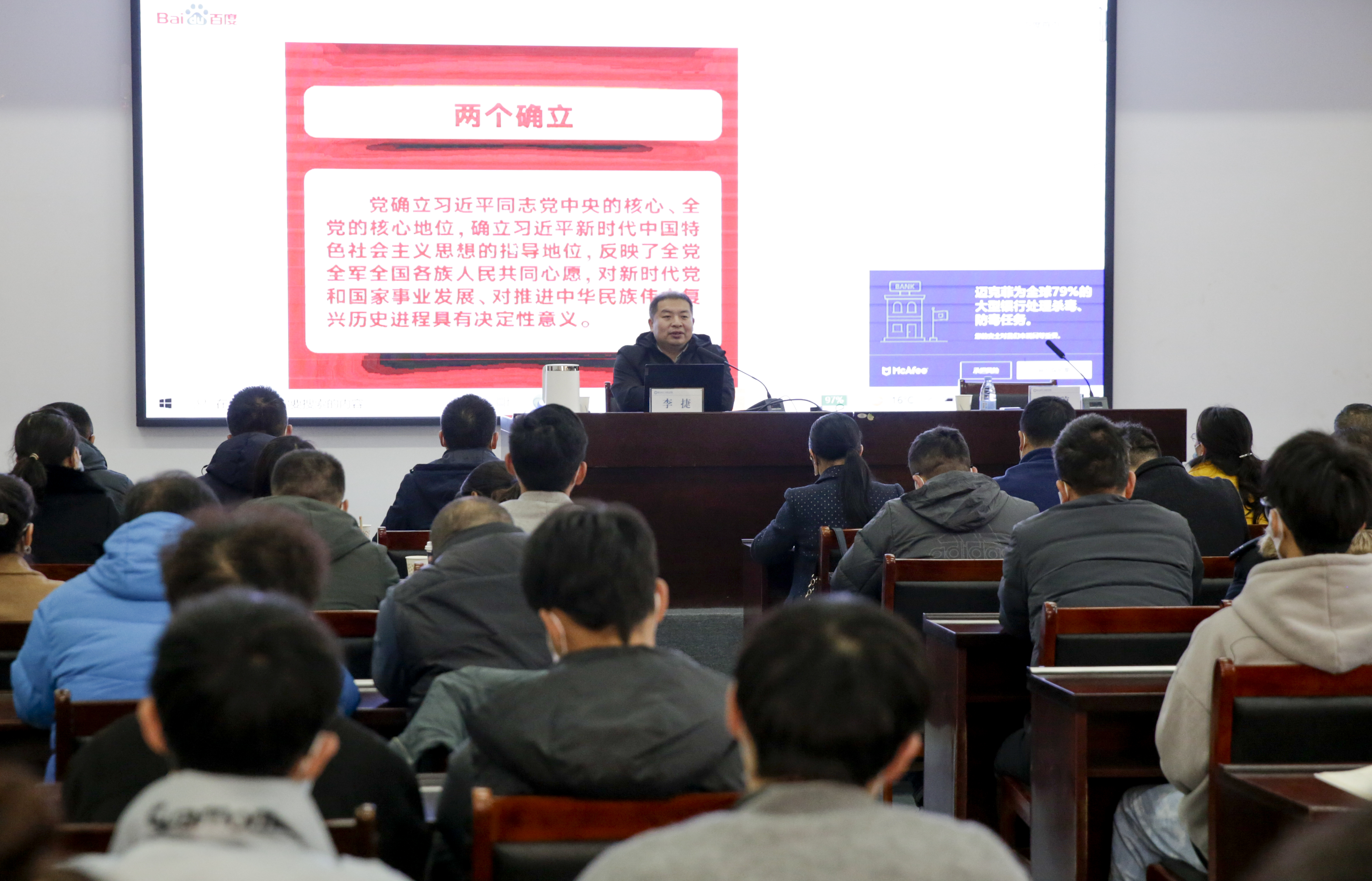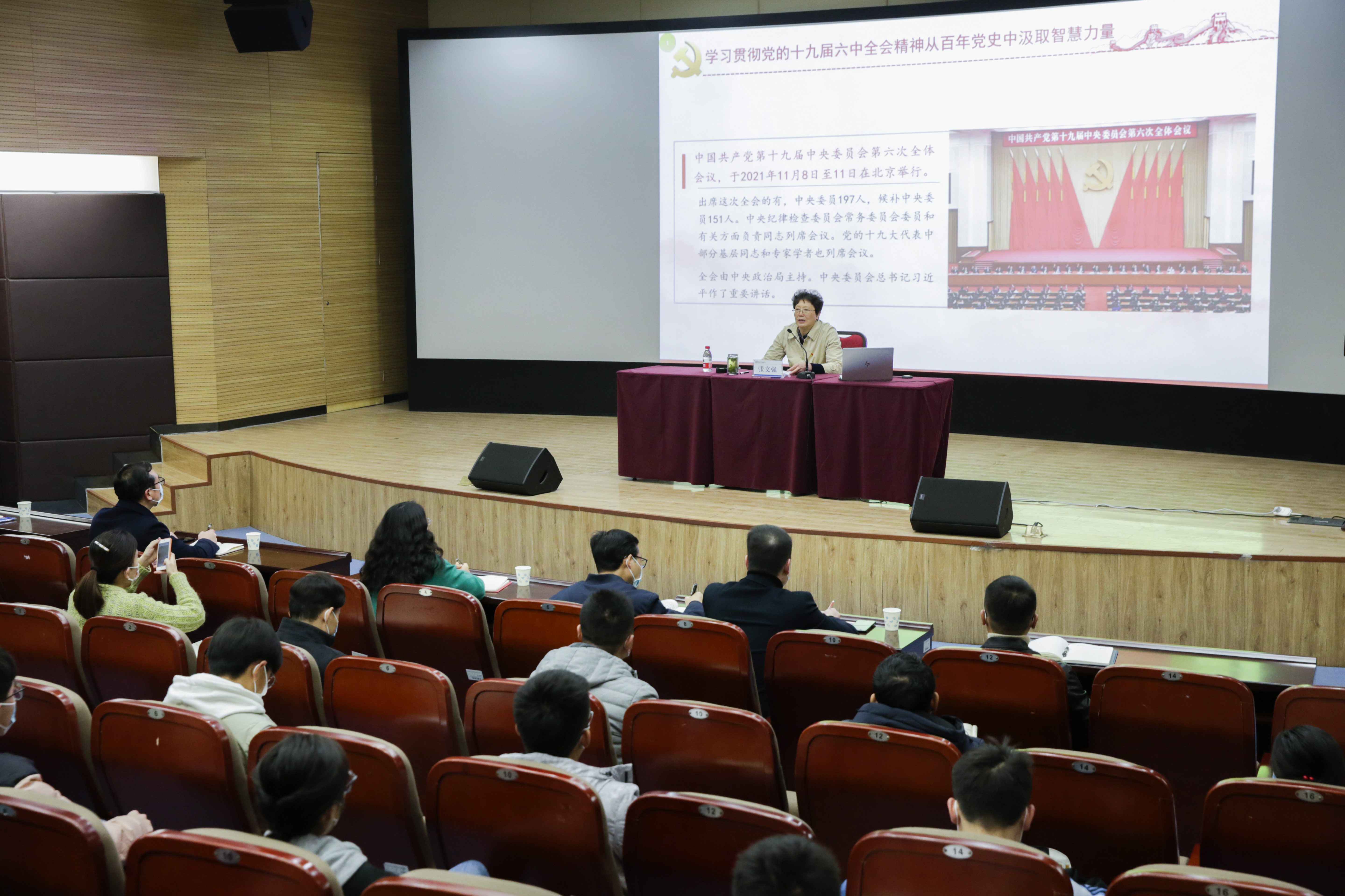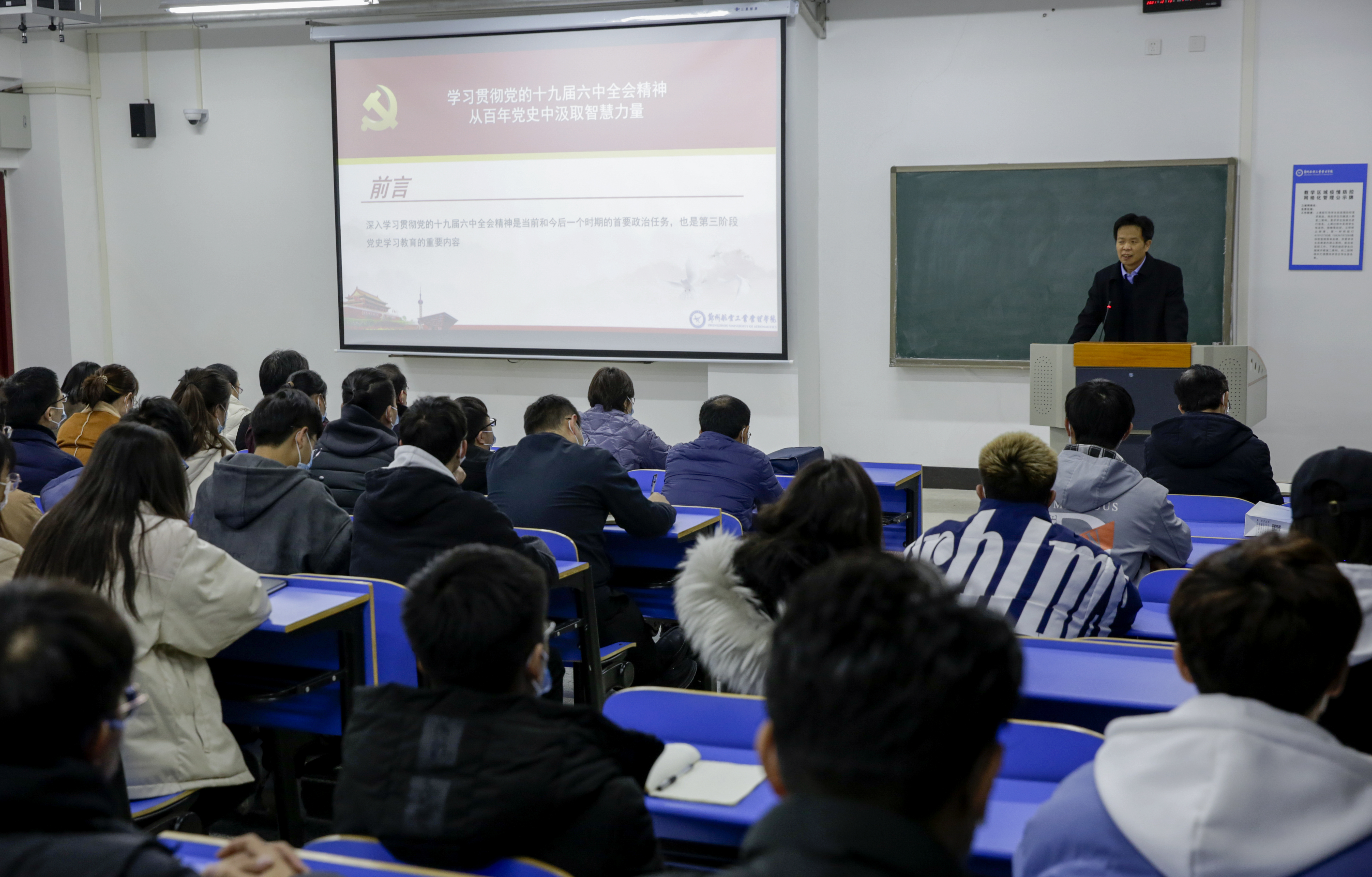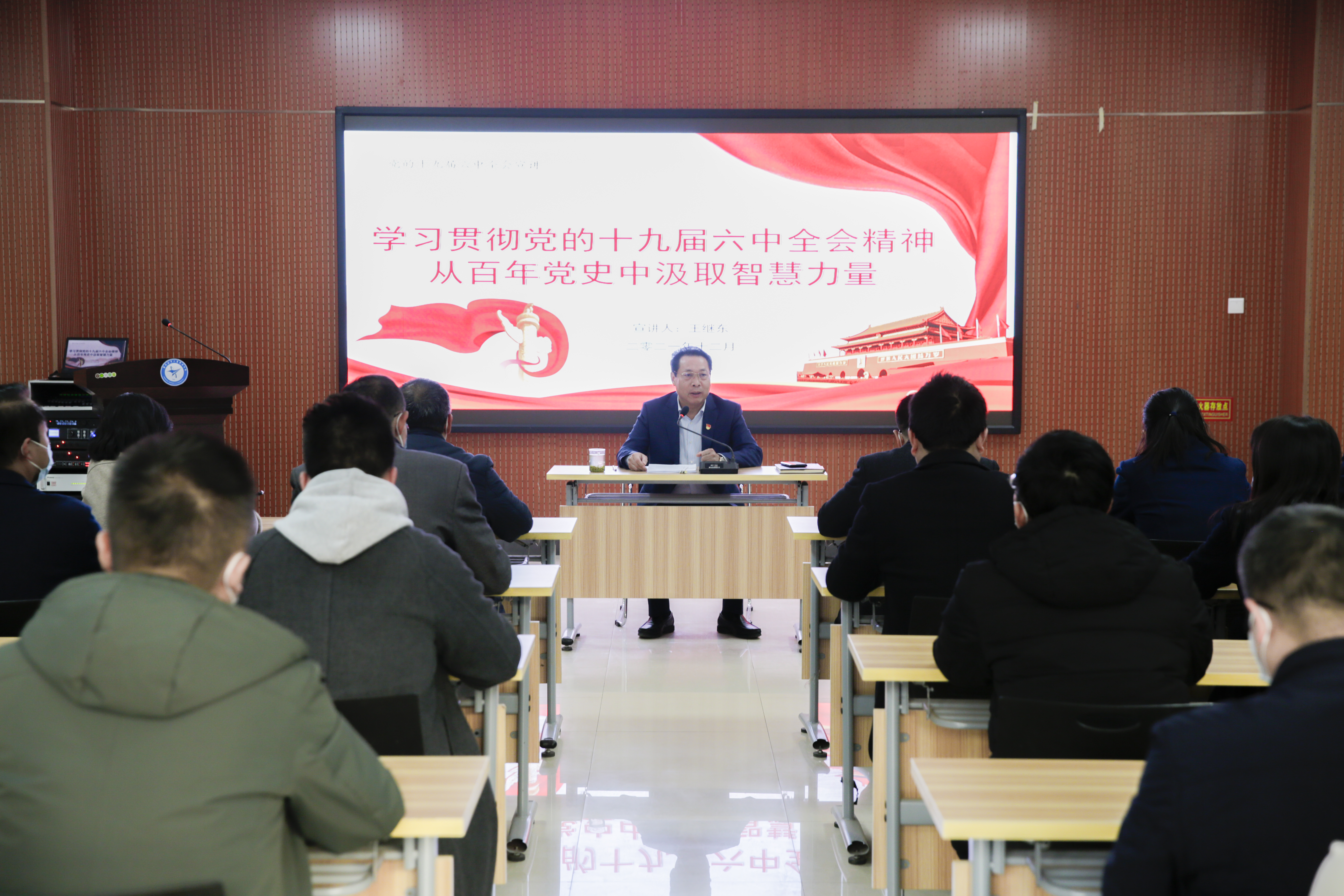 12月9日,副院长李捷以《学习贯彻党的十九届六中全会精神 从百年党史中汲取智慧力量》为题讲授专题思政课。