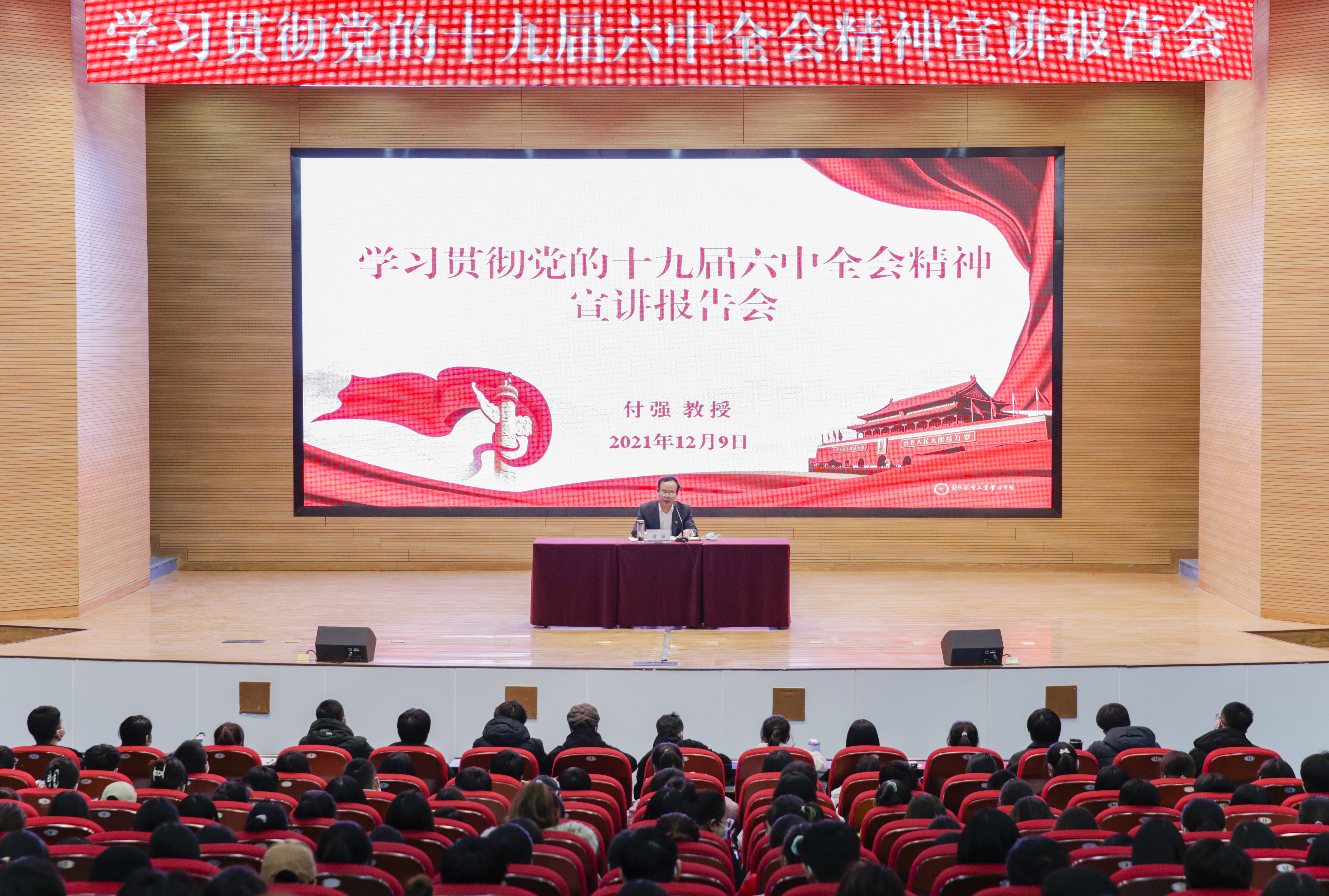 12月9日,校党委书记付强以《从百年党史中汲取智慧力量,奋力开创我校改革发展新局面》为题讲授专题思政课,为师生宣讲党的十九届六中全会精神。党委中心组成员、党委各部门和主要行政部门科级以上干部、商学院师生代表、马克思主义学院教师等400余人参加专题思政课学习。