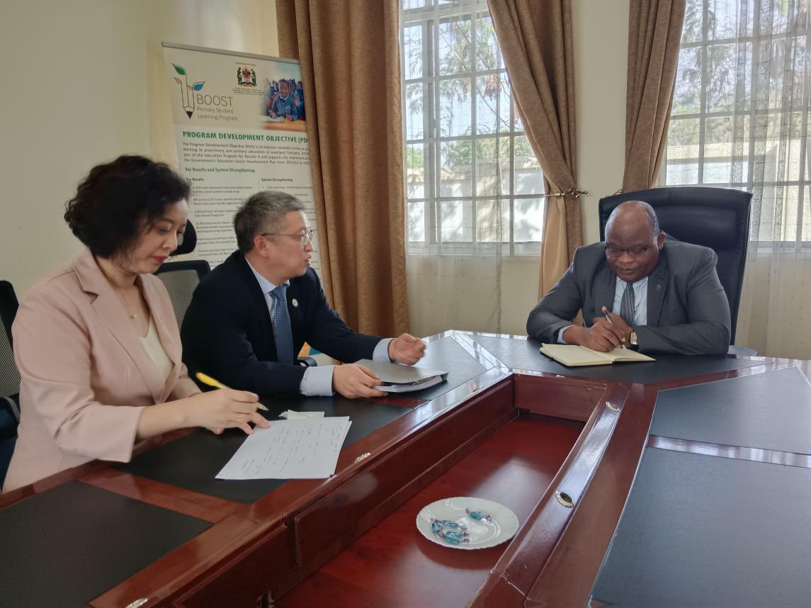 在坦桑尼亚科学教育技术部,常务副秘书长詹姆斯·穆迪欧会见代表团一行。詹姆斯·穆迪欧对代表团访问坦桑尼亚科学教育技术部表示热烈欢迎,对郑州航院为坦桑尼亚国际中文教育付出的努力表示赞赏。他表示,坦桑尼亚科学教育技术部将继续支持郑州航院在坦开展教育合作项目。刘代军代表学校,感谢坦桑尼亚科学教育技术部多年来对多多马大学孔子学院的关心支持,并邀请詹姆斯·穆迪欧适时来校访问。