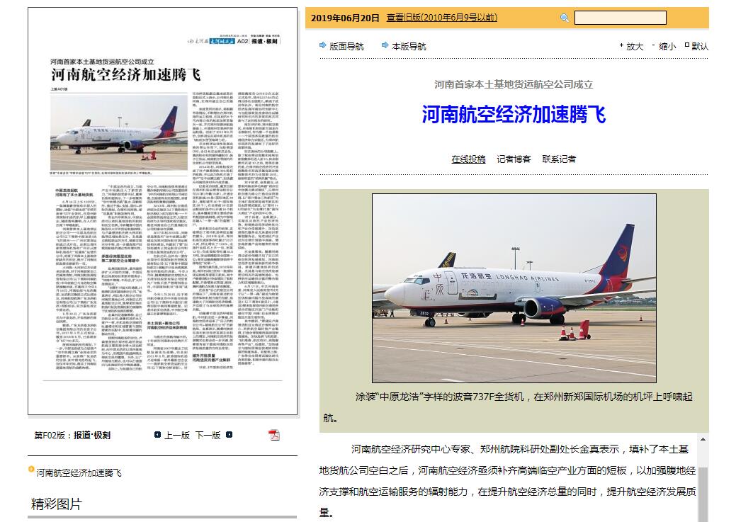 近日,《大河报》大河财立方记者就“河南首家本土基地货运航空公司成立”及河南航空经济发展新格局采访河南航空经济研究中心专家、郑州航院科研处副处长金真教授。6月20日,《大河报》第F01、F02版以“河南首家本土基地货运航空公司成立——河南航空经济加速腾飞”为题刊发相关报道。