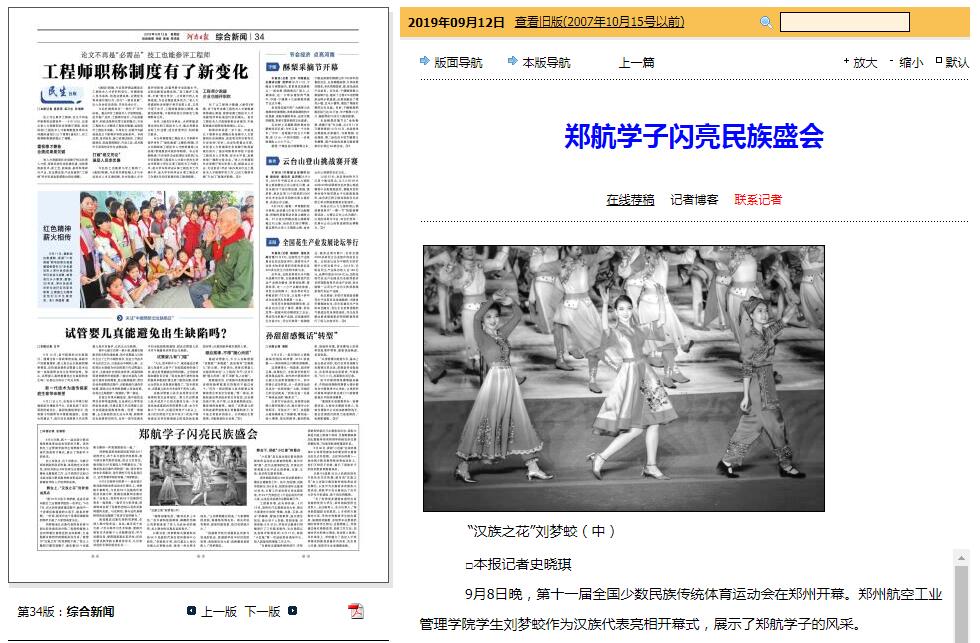 9月12日,《河南日报》综合新闻版以“郑航学子闪亮民族盛会”为题详细报道了我校通过人才培养的高质量服务社会的成果。
