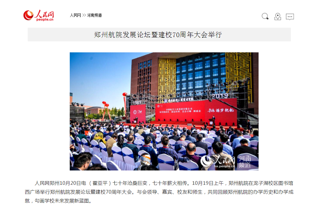 10月19日,我校在龙子湖校区举行郑航发展论坛暨建校70周年大会,各地校友从大江南北回到母校怀抱,见证母校的辉煌。郑州航院研制的工业级无人机“郑航一号”在大会上正式亮相。河南广播电视台、郑州电视台,《河南日报》《郑州日报》《工人日报》《郑州晚报》《河南教育》,央广网、凤凰网、搜狐、中华网等媒体单位的记者莅临学校进行了采访报道。