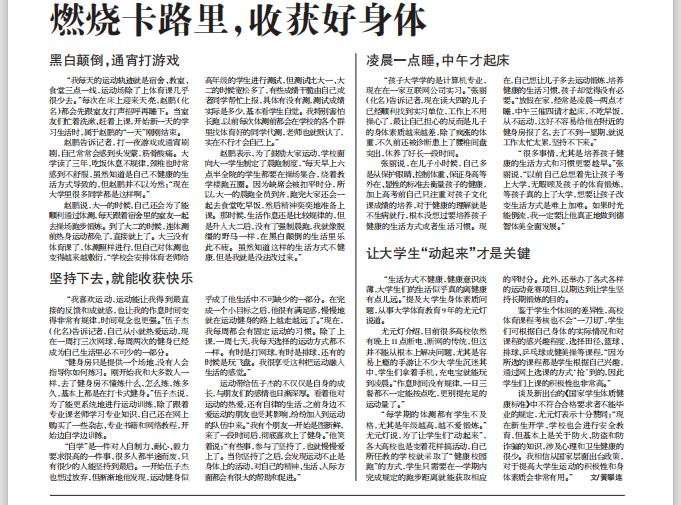 尤元灯告诉记者,提高学生身体素质应从娃娃抓起,中小学更应该强化体育在教育中的作用。对于大学生来说,关键是要让他们“动起来”,远离不健康的生活方式,养成良好的作息习惯,避免过度依赖手机和网络。“就郑州航院来讲,除了开展‘健康校园跑’外,还积极举办各式各样的运动竞赛项目,努力达到培养学生坚持长期锻炼的教育目的。”