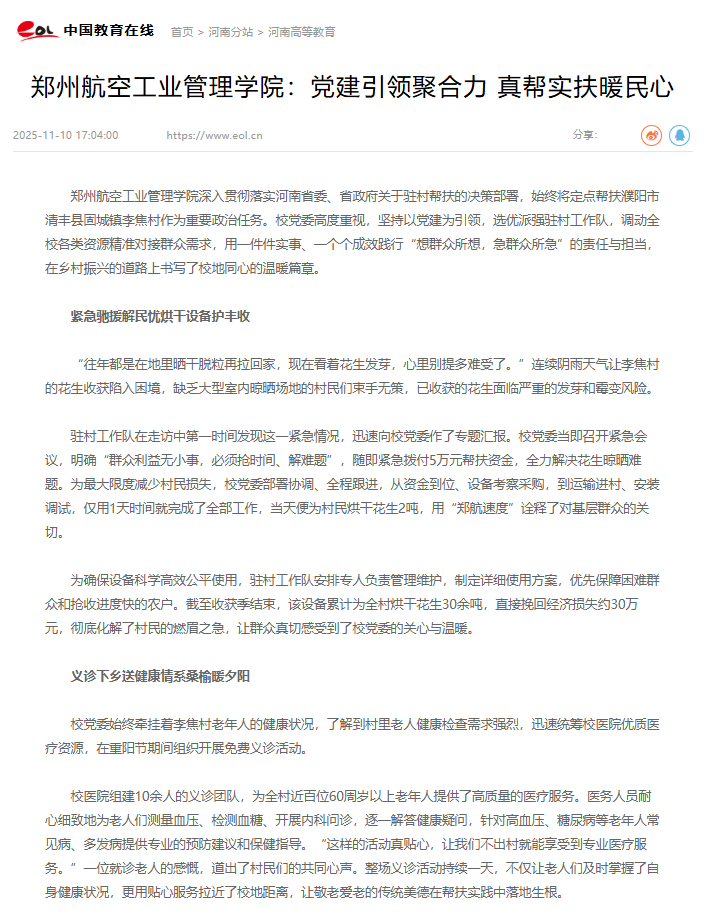 近日,中国教育在线、河南教育宣传网、大河报·豫视频、顶端新闻、正观新闻、网易新闻、搜狐新闻、新浪新闻、今日头条发布文章《郑州航空工业管理学院:党建引领聚合力 真帮实扶暖民心》,对我校驻村帮扶工作进行宣传报道。